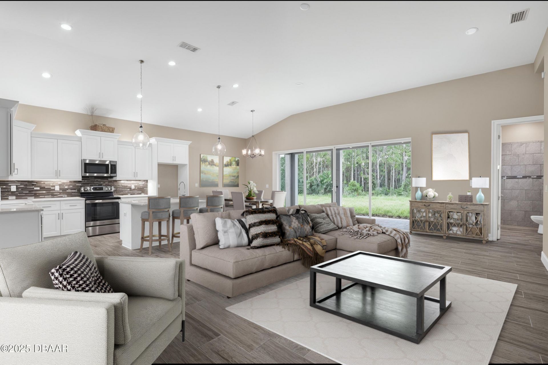 Brand new move-in ready home built by one of Daytona Beach's Premier builders Adley Homes. The Somerset model features a 2 Car Garage with a 2 Car Carport, a gourmet kitchen with a large island, upgraded cabinets with dovetail joints, soft close doors and drawers stainless steel appliances, upgraded quartz countertops, porcelain tile throughout 8 foot doors With upgraded casing around the openings, taller baseboards, 12 foot ceilings in the living area 10 foot ceilings in the bedrooms, nesting glass doors opening up to a covered back porch plenty of room in the backyard to add a pool The home backs up to a wooded conservation area, 16 seer trane air conditioning system, energy efficient water heater 8 foot insulated garage door ladder access to the attic an alarm system hardwired to every opening, structured wiring with TV and Internet cables to every room. OWC Seller Financing for well qualified buyers.