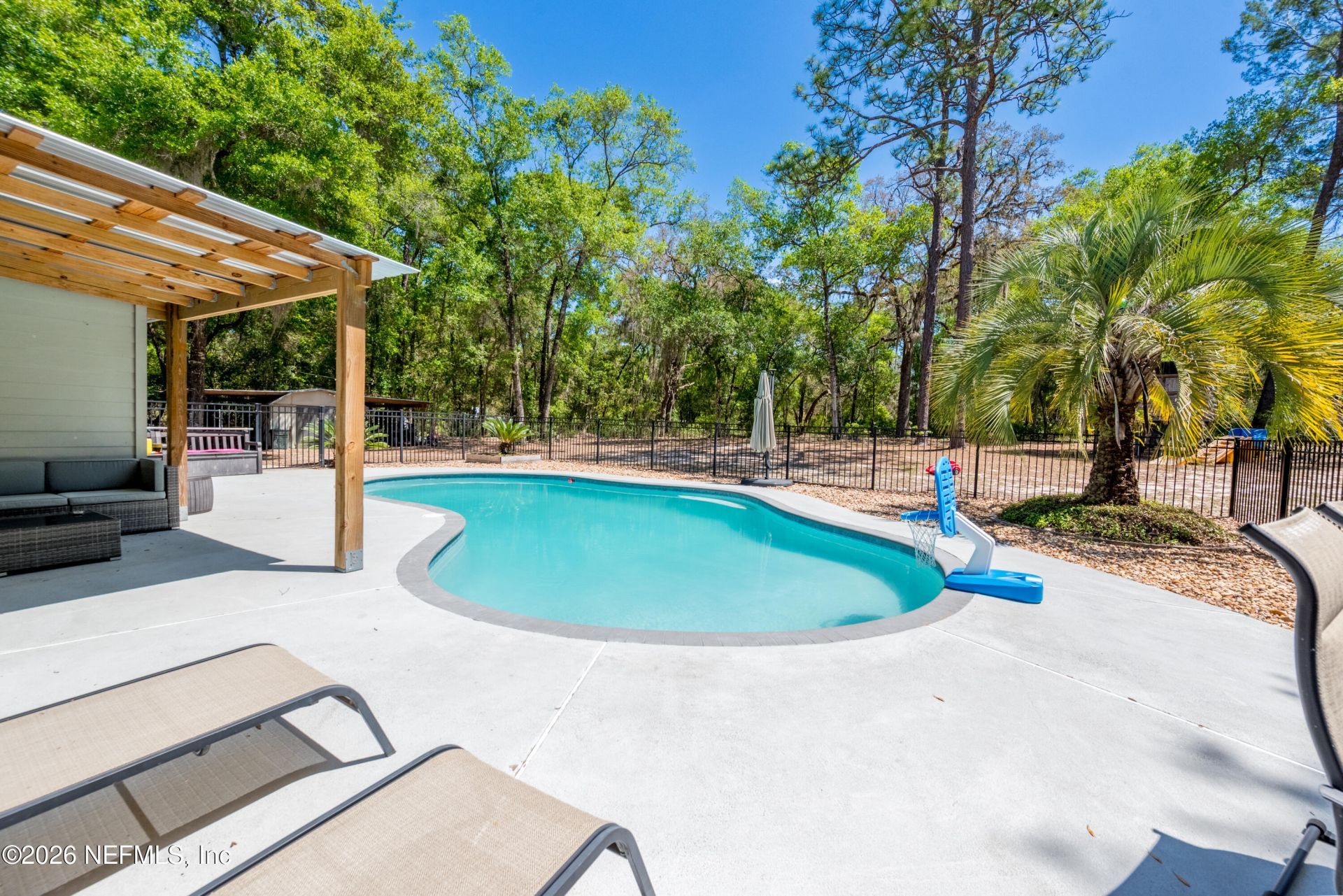 Welcome to your private slice of North Florida living where space and serenity come together on 3 beautiful acres in Melrose, Florida. This well maintained 4 bed, 2 bath home features a split floor plan with over 2100 sq ft of comfortable living space. The living room is stunning with vaulted wood ceilings, tons of natural light, and a cozy fireplace that really gives the home character. The kitchen offers wood cabinets, stainless steel appliances, and bar seating, along with a dining room. The primary suite is spacious and includes a nice bathroom with dual vanities and a tiled walk in shower. A bright sunroom overlooks the pool area, adding extra space and a great spot to relax. Step outside to enjoy the in-ground pool, renovated in 2023, with a mix of open yard and mature trees. The garage features a built-in bar, offering flexibility for a workshop, recreation space, or entertaining space. One of the BIGGEST highlights is the private access to Lily Lake. This spring fed, sandy bottom lake is known for its clear water and is ideal for boating, skiing, kayaking, and fishing. The deeded access is located at the end of the road and offers a quiet setting where you can enjoy the water and the wildlife. If you've been looking for acreage, privacy, and a pool home with character and tons of space, this one is definitely worth the look!!